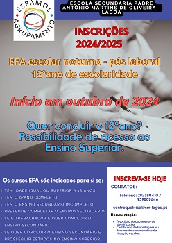 Publicado em 2024-09-25 - 13:50:00O curso EFA Escolar Noturno - pós-laboral inicia-se em outubro.